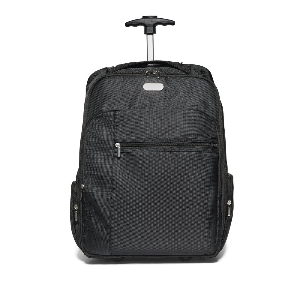 A rugged 17" laptop trolley backpack built from 1680D and 300D fabric for dependable daily travel. The padded, cushioned main compartment includes a divider to secure a laptop up to 17", while the spacious interior and front organizer pockets neatly store documents and accessories. Two zippered side pockets keep small essentials close at hand. Smooth-rolling wheels with a protector, padded carry handles, and an extendable metal spring grip offer multiple carry options. A removable magnetic metal plate on the front allows easy branding by laser (plate supplied separately). With up to 28 L capacity and a weight of 1.80 kg, it’s designed for organized commuting and short trips.