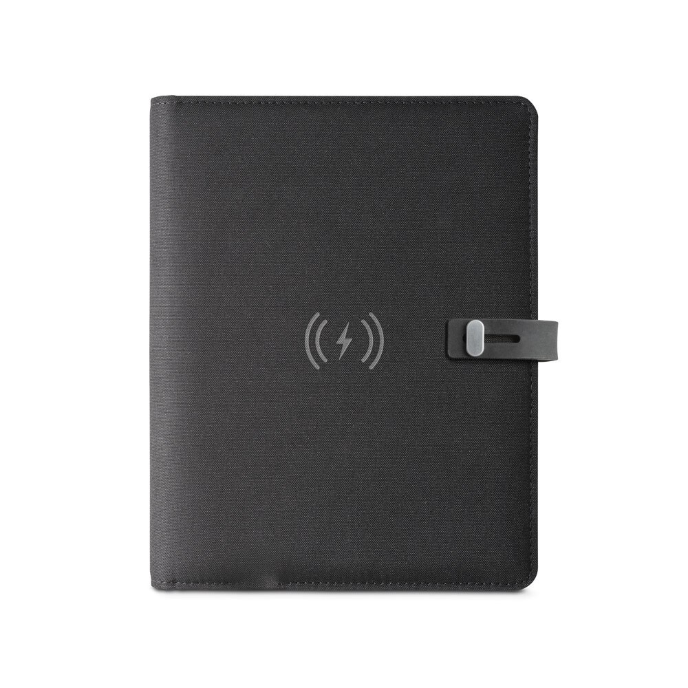 Combine productivity and power in one sophisticated package. This A5 portfolio, crafted from durable 300D recycled polyester, features an integrated 5,000 mAh power bank for seamless wireless charging on the go. Its sleek, minimalist exterior with a secure strap closure opens to reveal a highly organized interior with a phone pocket, card slots, and a pen loop. Complete with an FSC™ certified 128-page notepad, it's the ultimate sustainable accessory for keeping your essential devices charged and your ideas flowing during any meeting or commute.