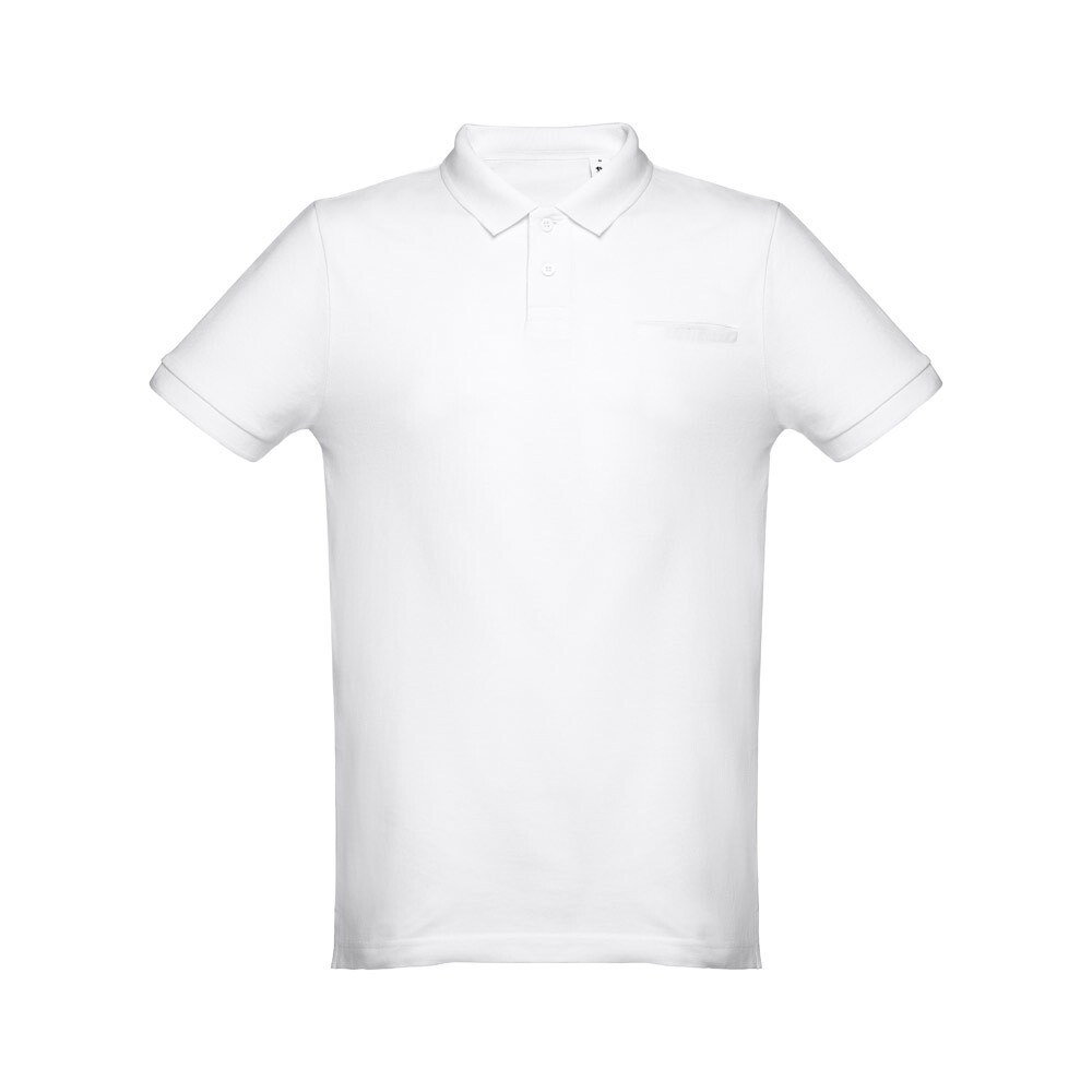 100% cotton pique men's short sleeve polo with carded cotton (195 g/m²). Elegant collar and rib sleeves, with a piqué reinforced collar. Reinforced placket with 2 matching colour buttons (extra button inserted in the inner seam). Modern cut with a single welted pocket on the chest. Cut and sewn piece with small side vents at the hemline of the polo. Sizes: S, M, L, XL, XXL