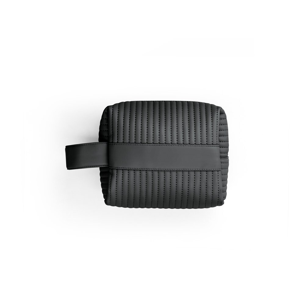 A compact PU handbag crafted with 21% recycled PU and a soft lining made from 30% recycled polyester. The exterior shows a modern quilted texture with neat vertical stitching, paired with a wide side handle for easy carrying. A smooth front strip in PU offers a clean area ready for personalisation or branding. The structured rectangular shape opens with a top zipper, providing practical storage for daily essentials, cosmetics, or travel items while keeping a refined look.