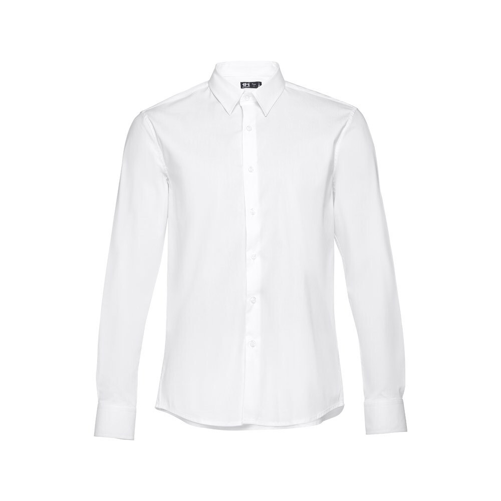 This men's long-sleeved shirt is crafted from a lightweight 115 g/m² blend of cotton, polyamide, and elastane, offering both comfort and a touch of stretch. The design features a classic point collar and a clean front placket with seven matching buttons for a cohesive look. The long sleeves are detailed with a single pleat and adjustable cuffs with a two-button fastening, allowing for a customized fit around the wrist. Its tailored construction makes it a versatile piece for any wardrobe.