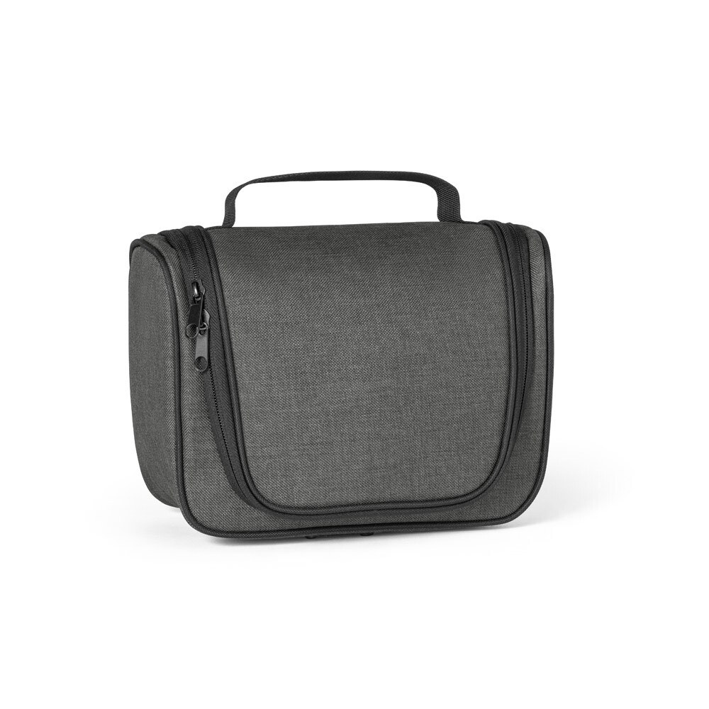 1 toiletry bag in high-density 600D with lining and integrated hanging hook.