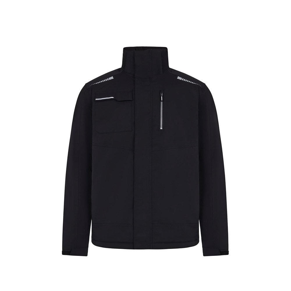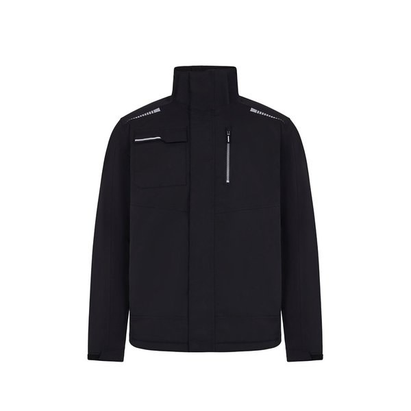 Quilted jacket (180 g/m²), made from recycled polyester (50%) and polyester (50%). Features water-repellent stretch fabric, heat-sealed seams, reflective details and a central zip fastening. The jacket has concealed buttons and six pockets (two side pockets, one left chest pocket, one right chest pocket and one inside pocket). Size: S, M, L, XL, 2XL, 3XL