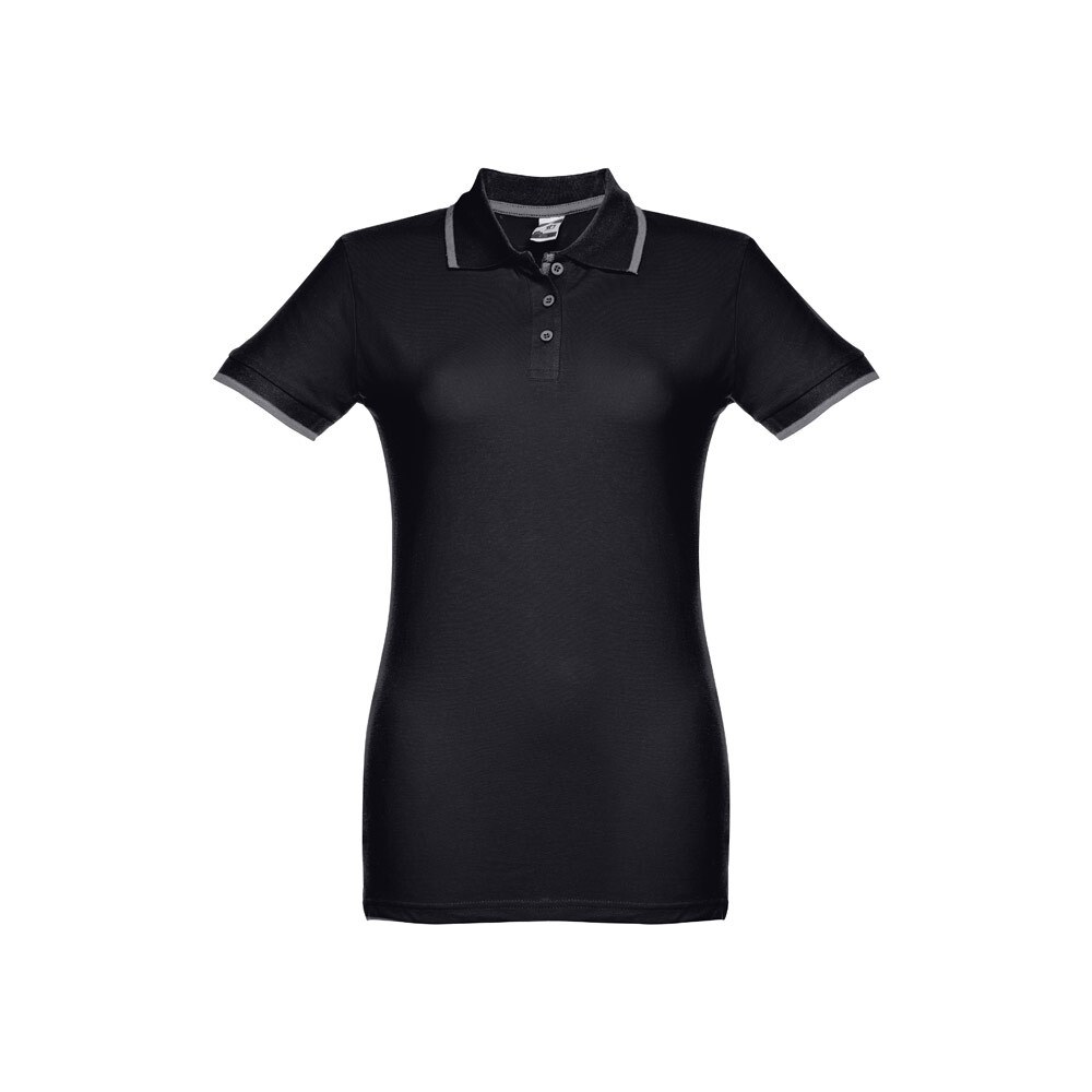 This women's slim fit polo shirt offers a flattering silhouette with its tailored waist and small side vents. The breathable cotton pique fabric (210 g/m²) ensures comfortable all-day wear. The polo features a ribbed collar and cuffs, adding a touch of classic style. A reinforced three-button placket provides durability and a polished look, with the added convenience of an extra button on the inner side seam. The two-tone contrast detailing on the collar, sleeves, and placket creates a subtle yet stylish accent. This versatile polo is ideal for both casual and smart-casual occasions.